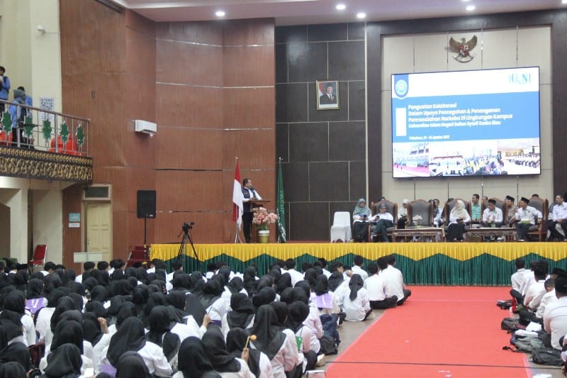 PEKANBARU, LaksamanaNews.com — Sebanyak 5.724 orang calon mahasiswa baru Universitas Islam Negeri (UIN) Sultan Syarif Kasim Riau mengikuti kegiatan Deklarasi Anti Narkoba yang diselenggarakan bersamaan dengan Kuliah Umum bertema “Penguatan Kolaborasi dalam Upaya Pencegahan dan Penanganan Permasalahan Narkoba di Lingkungan Kampus”. Kegiatan ini merupakan bagian dari rangkaian Pengenalan Budaya Akademik dan Kemahasiswaan (PBAK) Tahun Akademik 2025/2026, yang dilaksanakan di Gedung PKM UIN Suska Riau dengan semangat dan antusiasme tinggi dari para peserta. Senin (25 /08/2025 )
