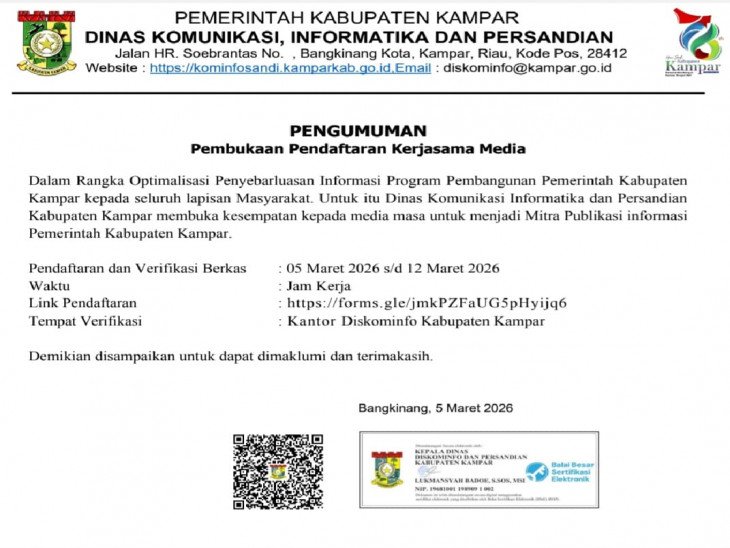 “Kami mengundang seluruh perusahaan media yang memenuhi ketentuan untuk mendaftar dan menjadi bagian dari mitra publikasi Pemerintah Kabupaten Kampar, sehingga informasi pembangunan dapat tersampaikan dengan baik kepada masyarakat,” tambahnya.
