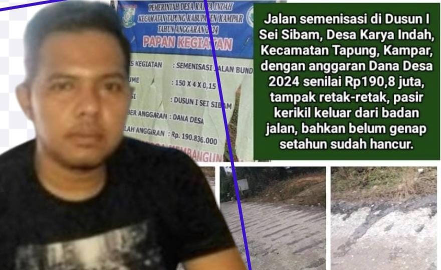 Di sisi lain, temuan investigasi di lapangan menguak fakta mencengangkan. Jalan semenisasi di Dusun I Sei Sibam, Desa Karya Indah, Tapung, Kampar, dengan anggaran Rp190 juta bersumber dari Dana Desa tahun 2024, rusak parah meski belum genap setahun selesai dikerjakan. Warga menuding proyek ini sarat dugaan mark-up, bahkan berpotensi menjerat aparat desa pada UU Tipikor.