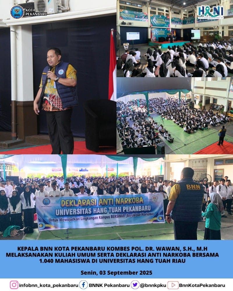PEKANBARU, LaksamanaNews.com Badan Narkotika Nasional Kota (BNNK) Pekanbaru terus memperkuat komitmennya dalam mencegah penyalahgunaan narkotika di kalangan generasi muda. Hal ini diwujudkan melalui kegiatan Kuliah Umum dan Deklarasi Anti Narkoba yang digelar di Universitas Hangtuah Pekanbaru, dalam rangka Pengenalan Kehidupan Kampus Mahasiswa Baru (PKKMB) bertema “Transformasi Mahasiswa Cerdas, Digital, Beretika, Siap Berprestasi dan Berdampak.”