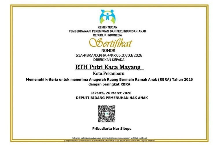“Alhamdulillah, kita sudah menerima pemberitahuan bahwa RTH Kaca Mayang mendapatkan Anugerah Predikat RBRA dari KemenPPPA. RTH Kaca Mayang merupakan satu satunya Ruang bermain yang ikut Penilaian Tingkat Nasional di Provinsi Riau,” ujarnya.
