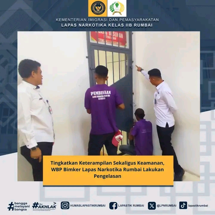 WBP Lapas Narkotika Rumbai melakukan pemasangan teralis besi pada pintu ruang besukan Lapas Narkotika Rumbai. Pemasangan teralis ini dengan metode pengelasan yang dipelajari dari pelatihan-pelatihan sebelumnya, Kamis (14/08/2025).